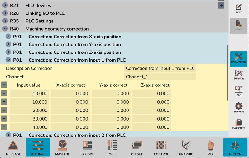 - Для группы "Коррекция: от входа 1 из PLC" - из переменной "TPLC.Channels[NumChannel.Channel_1].СorrectGeometry1" в PLC.
