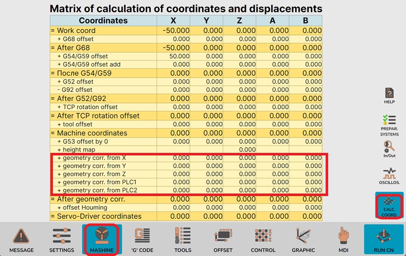 Проконтролировать работу системы коррекции геометрии можно на странице "Станок"-"Расчет координат".