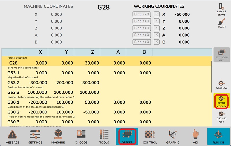 На странице "Смещения"-"Референсные координаты" выберите строку с наименованием "G53.1 Нулевые машинные координаты"