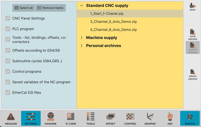 На правой панели выберите группу "Штатная поставка ЧПУ" -> "1_Start_1-Chanel.zip"